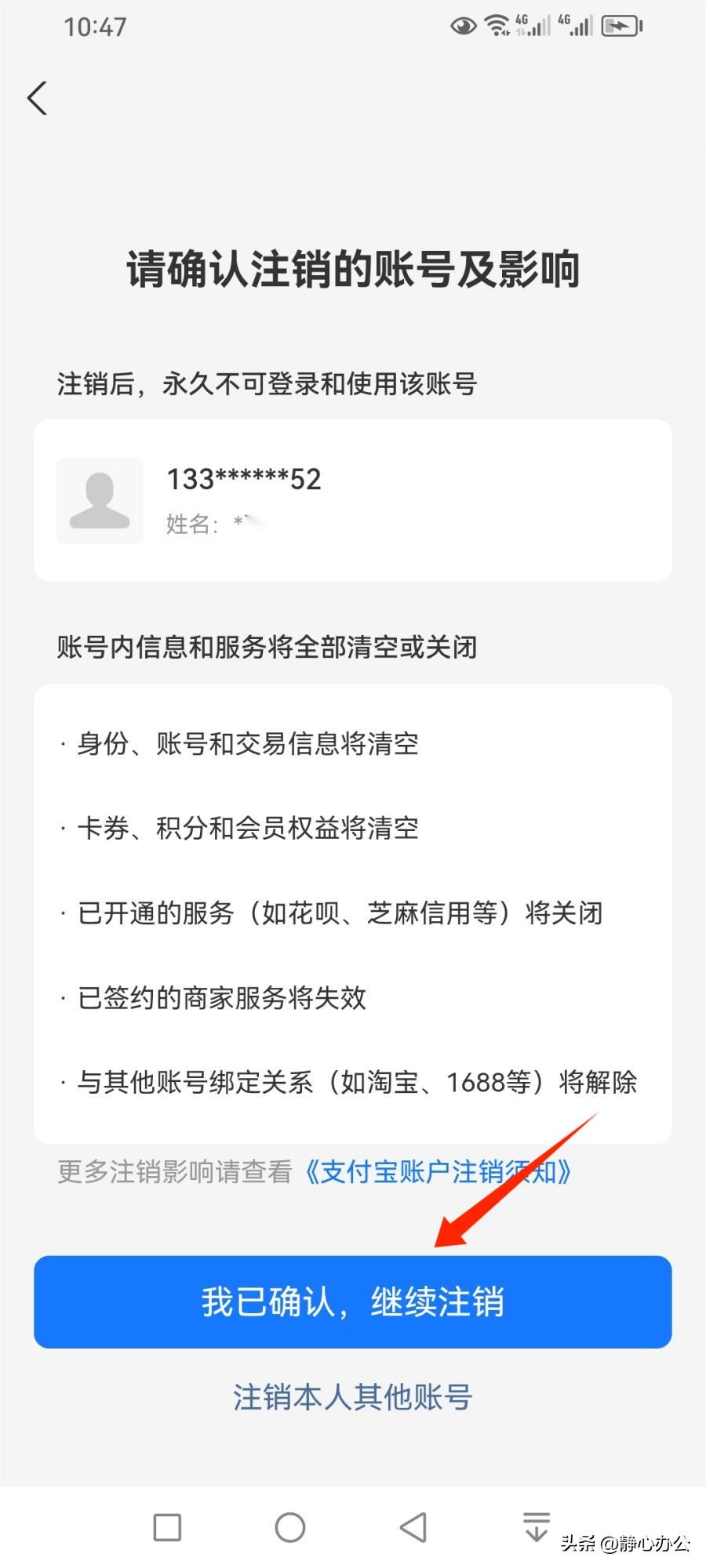 验证完毕,会提示确认注销的账号及影响,如果确定要注销该账号,点击【我已确认,继续注销】。