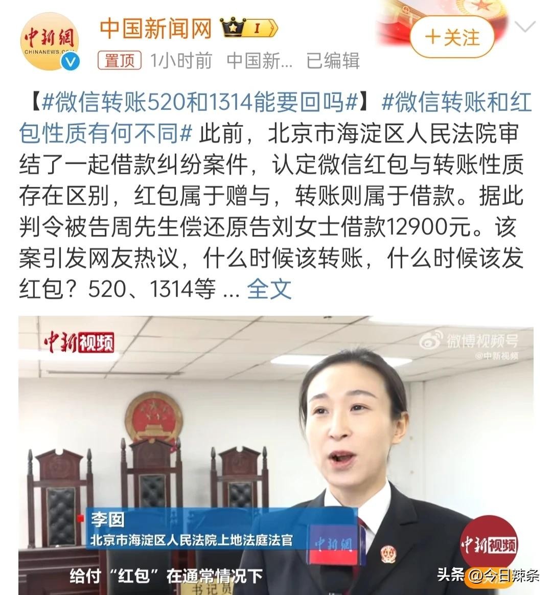 就在最近,北京市海淀区人民法院审结了一起借款纠纷案件。案件中,被告周先生通过微信转账方式向原告刘女士支付了多笔款项,其中包括一些金额为“520”、“1314”的转账。法院在审理过程中,认定微信红包与转账性质存在区别,红包属于赠与,而转账则可能被认定为借款。最终,法院判令被告周先生偿还原告刘女士借款12900元。