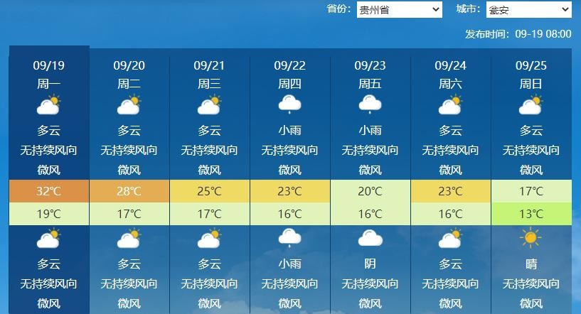 ▶ 周四至周五(9月22日-9月23日),多云转阴天有阵雨或雷雨,气温下降,最高气温降至21.0;