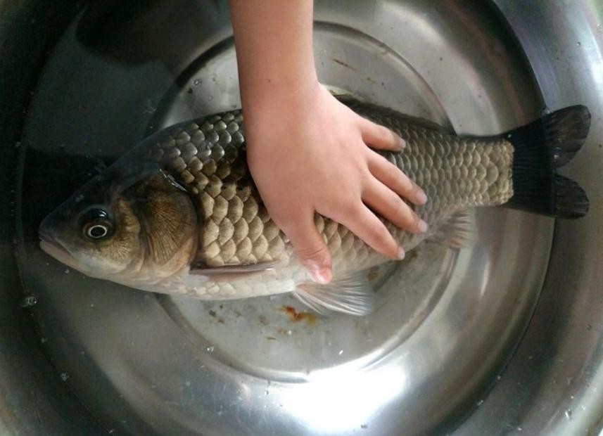 据说,这条大鲫鱼很难得,因此不舍得吃,准备先养起来...