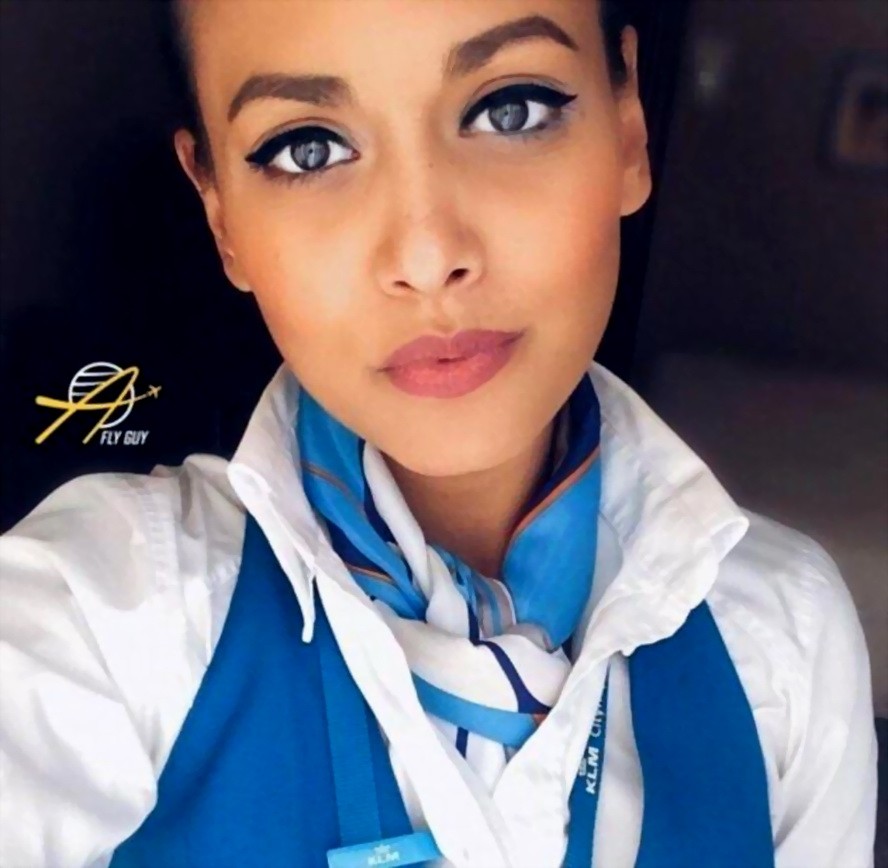 这位空姐来自荷兰皇家航空公司。她的眼睛很大,眼神迷离。