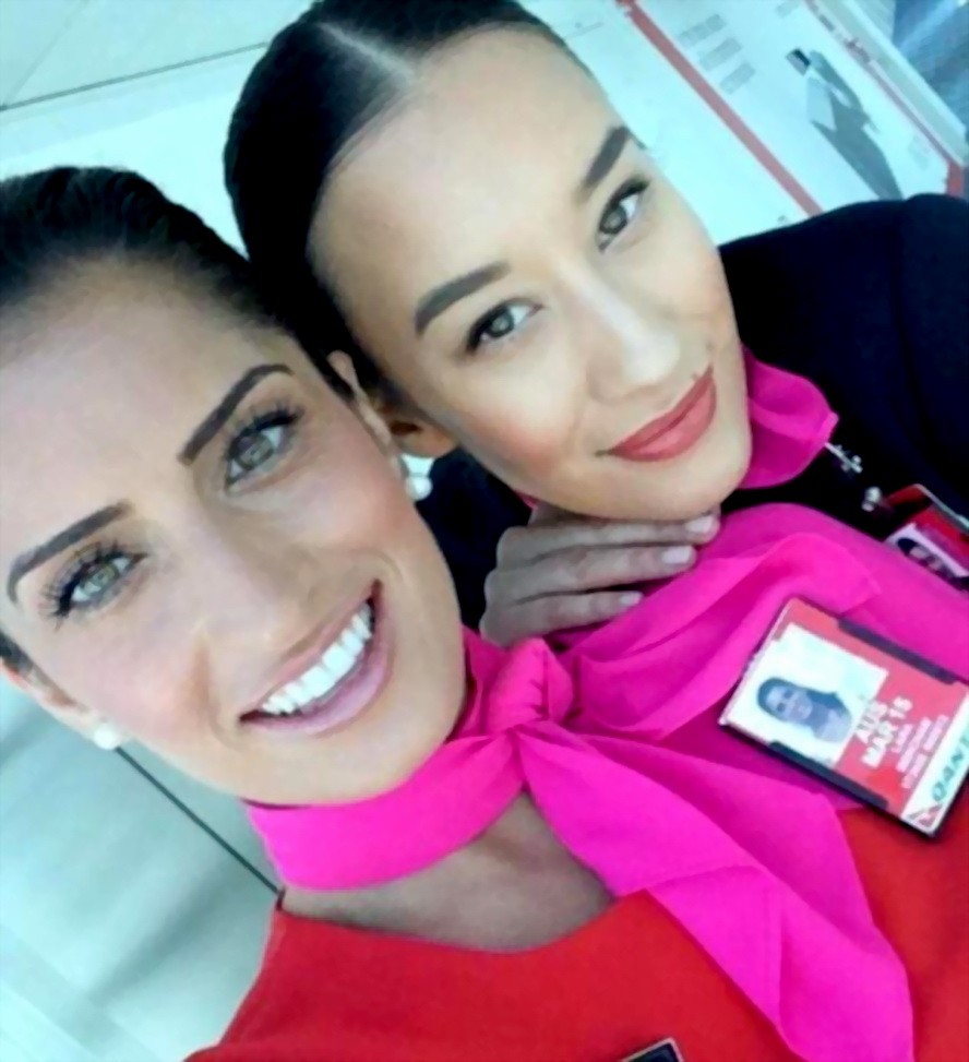 这是两位澳洲航空空姐的自拍照片,她们戴着亮粉色的丝巾,肯定会吸引飞机乘客的目光。