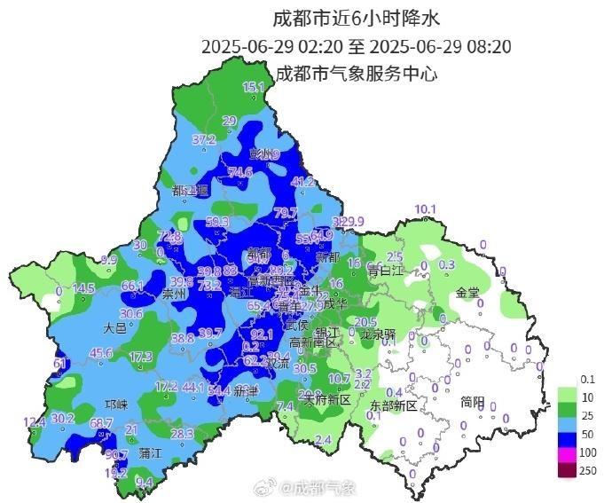 6月28日7时到29日7时总体来看,成都中西部出现雷阵雨天气,全市共计出现暴雨86站,大雨134站。最大降水量出现在郫都体育中心96.9毫米,其余区(市)县最大降水量为:温江88.5、蒲江87.9、双流85.7、都江堰70.4、崇州68、青羊区66.1、金牛区66、邛崃66、高新区64.4、大邑63.9、武侯区57.9、新津57.4、彭州54.2、新都39.6、锦江区19.9、天府新区15毫米。成都市双流、大邑、崇州、温江、新津、邛崃、高新区7个区(市)县出现瞬间最大风速大于10.8m/s(6级)的大风天气,最大风速出现在双流彭镇金河18.2m/s(8级);气温20~34.8℃。