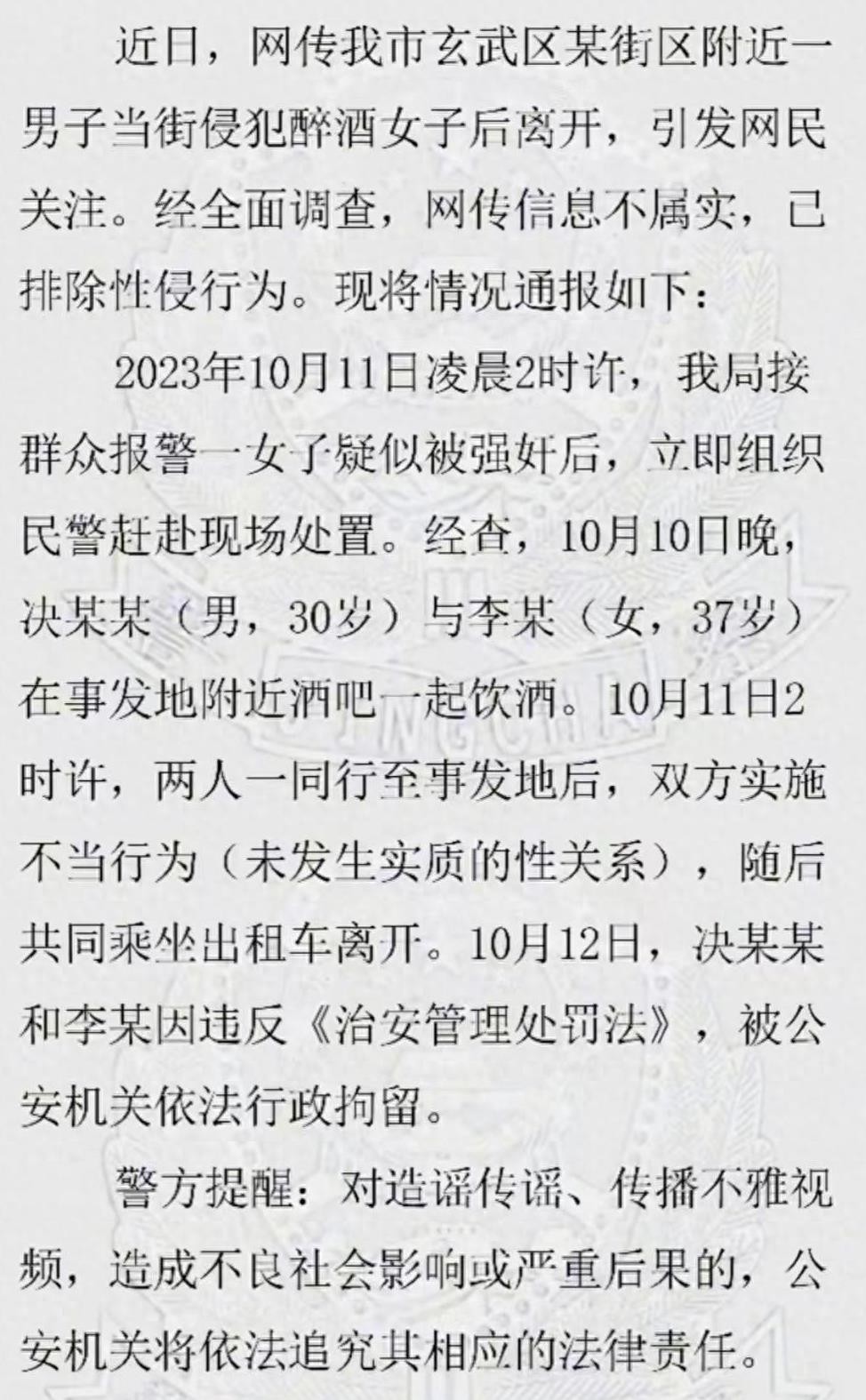随后,南京市公安局玄武分局发布了一份通报,对事件进行了官方说明。通报中指出,网上传闻不准确,特别是与性侵相关的指控被排除在外。根据通报提供的信息,事件的两位当事人分别是一名年仅37岁的女性和一名30岁的男性。根据不完整的视频和照片,警方认为女性没有反抗,男性没有脱衣服,因此事件被定性为没有实质性的关系。