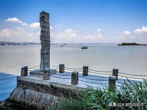 沿着海边栈道前行,就到了“过番纪念码头”,这里是汕头古码头的遗址地。一个叠立在海堤边上过番海里纪念柱。柱子有很多块三角形层叠构成,上面刻有到东南亚国家的海里数字。在以前交通不发达的年代,下南洋都是靠红头船,这里让人真切感受到那时的人们“背井离乡、漂泊异国、离愁别绪”的艰难历程。