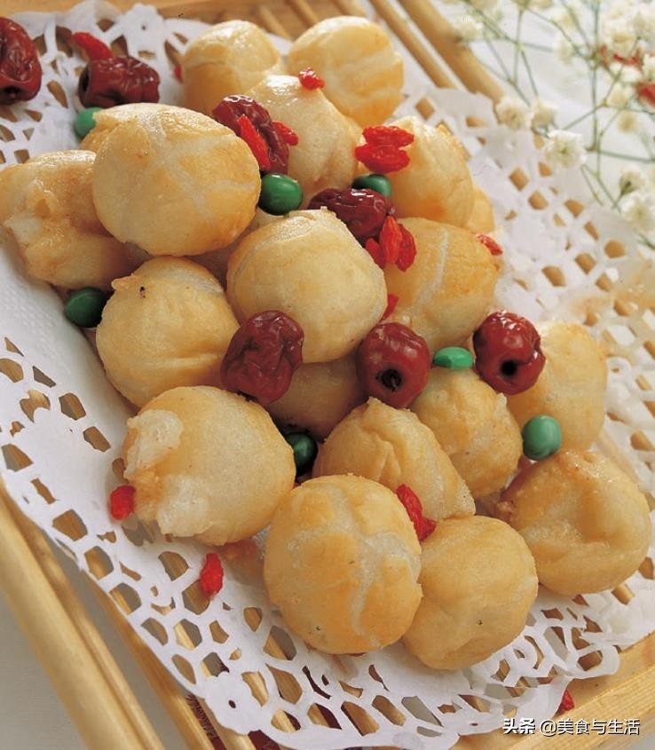 3. 起油锅烧热,下入汤圆炸至金黄色捞出,撒上小枣、熟豌豆、枸杞拌匀,装盘即可。