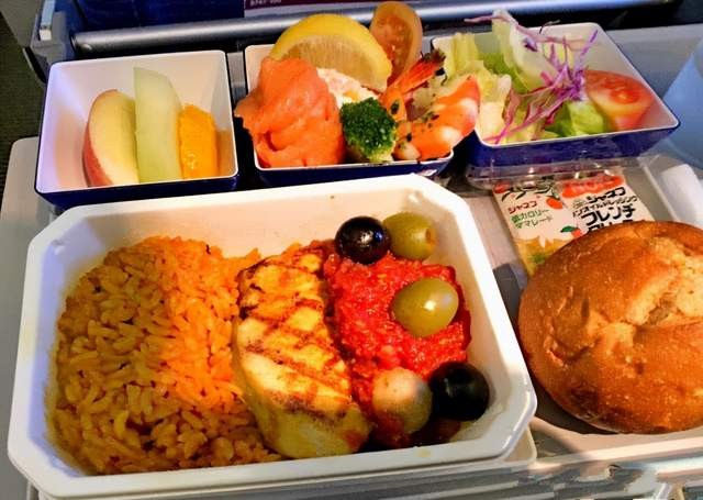这家航空公司还提供海鲜餐,蛋包饭搭配鱼子酱和青梅、海鲜包括虾仁、生鱼片,这还只是经济舱的伙食,商务舱和头等舱想必更加奢华吧。