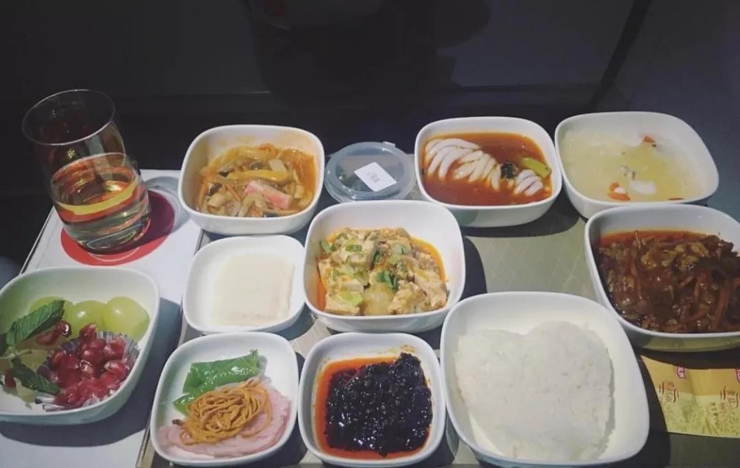 川航被誉为我国最强的“喂猪航班”,伙食之丰富让你意想不到。水煮肉片、麻婆豆腐、宫保鸡丁、酸菜鱼可供选择。