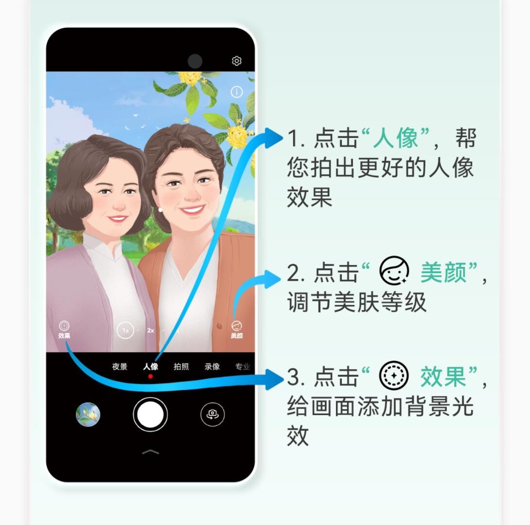 平时我们除了拍摄美景美食外,拍摄人像照片也比较多,那么如何拍出好看的人像照片呢?华为手机有专门拍摄人像的功能,可以帮助我们拍出更好的人像效果,点击美颜可以调节美肤等级,点击效果可以给画面添加背景光效。