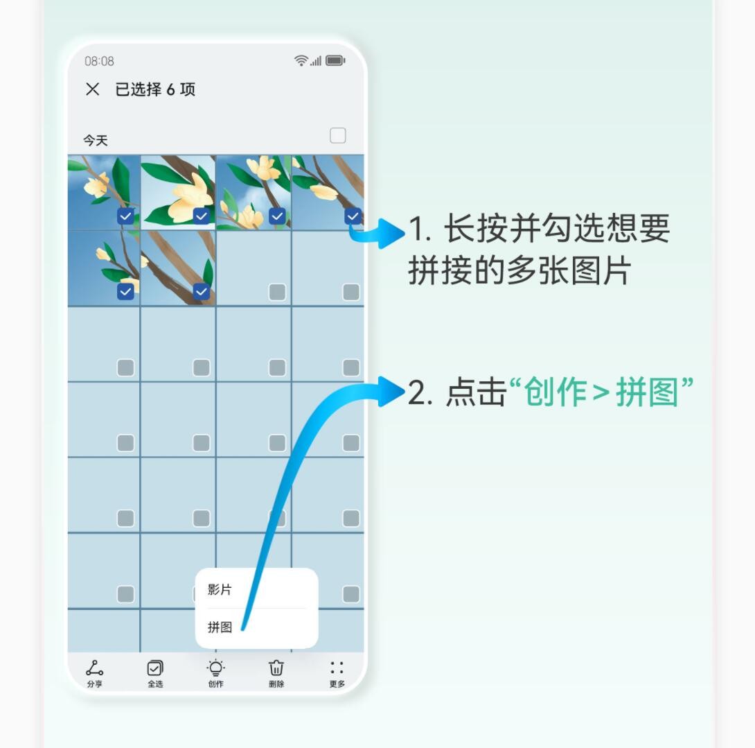 我们在发朋友圈时,想发的照片太多怎么办呢?我们可以将多张照片拼成一张照片。打开图库,长按并勾选想要拼接的图片,点击创作,点击拼图,根据需要选择不同的拼接方式和形状,最后拼接好照片后,点击保存照片完成。