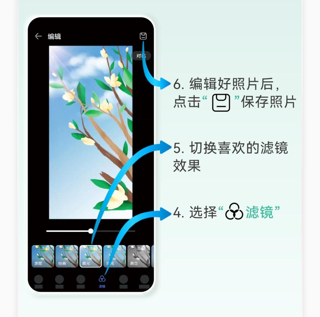 图片拍摄完成后,如何给我们拍摄的照片添加滤镜呢?我们在手机桌面找到图库,找到想要编辑的照片,点击进入编辑页面,选择滤镜,就可以切换各种滤镜效果了,最后我们把编辑好的照片保存即可。
