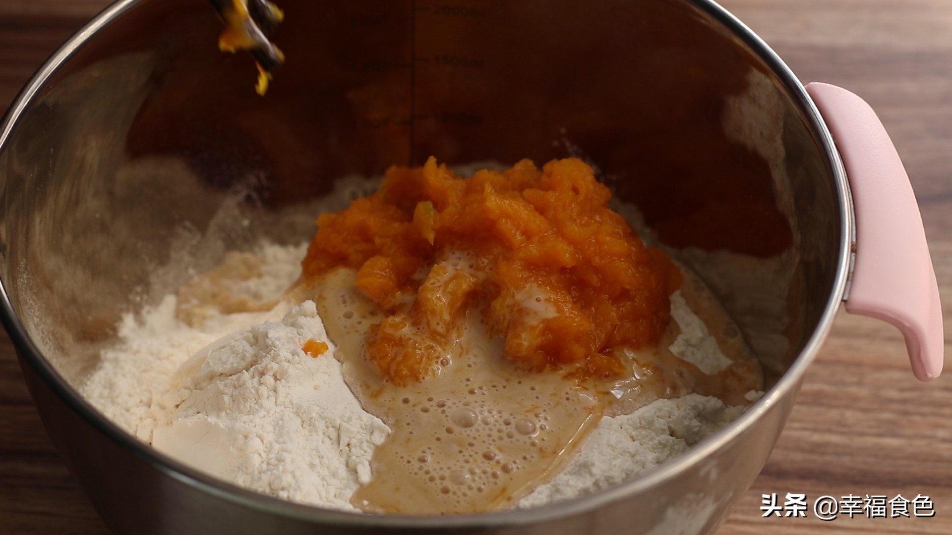 4、盆中放入500克面粉,加入捣烂的南瓜泥,加入酵母调成的适量清水。