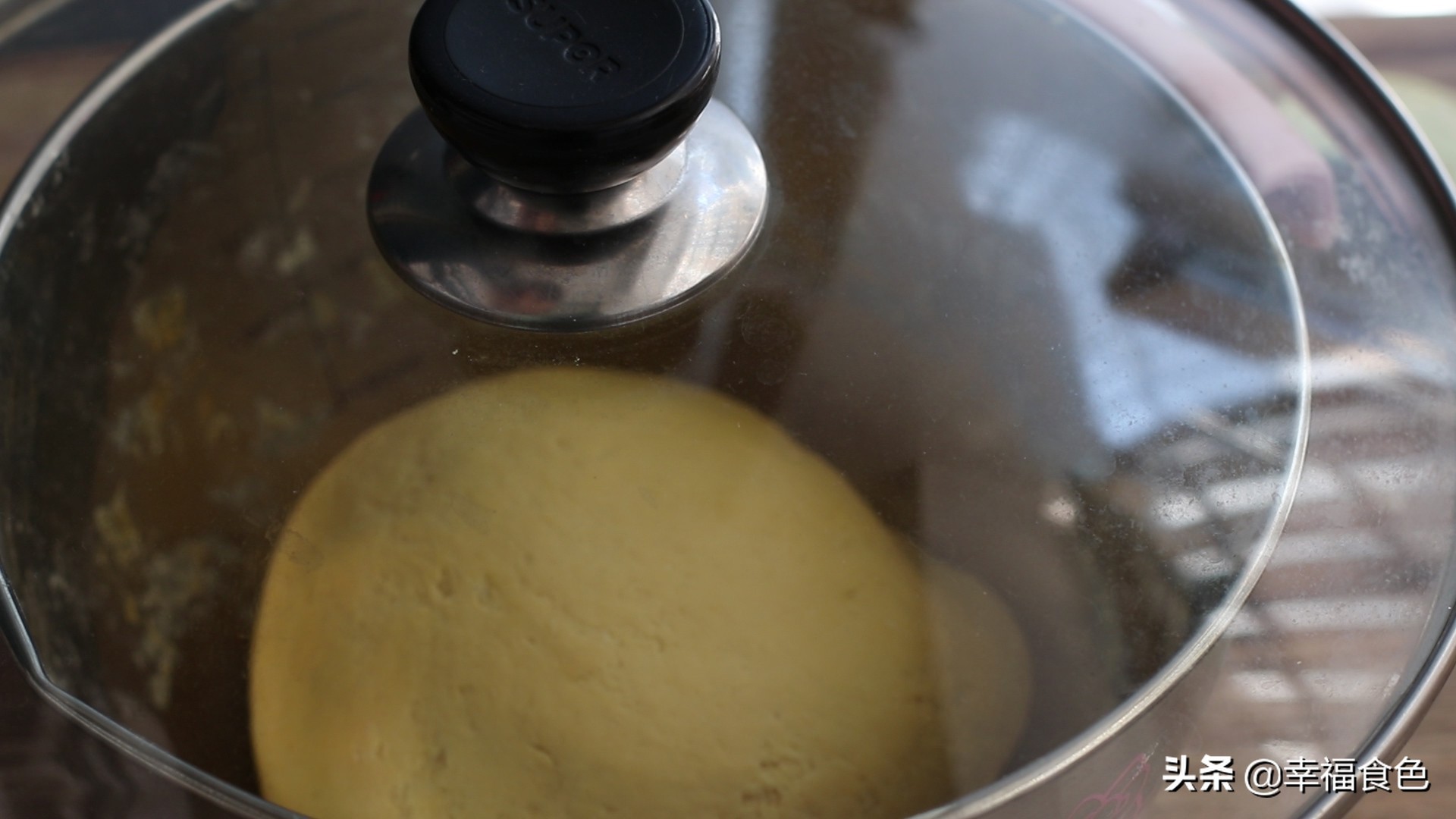 6、揉好的面团盖上盖子发酵至2倍大。发酵的时间夏天的话1到两个小时差不多了,冬天气温低时间会长一些,注意随时观察面团发酵的情况。