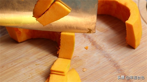 1、将南瓜洗净去皮去瓤后切成片状。稍微切薄一点比较容易熟。