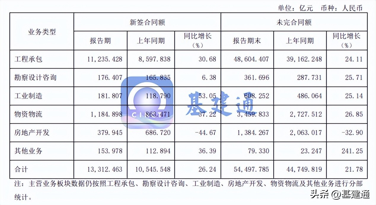 2022年上半年,中国铁建新签合同额13312.463亿元,完成年度计划的46.29%,同比增长26.24%。其中,境内业务新签合同额12239.170亿元,占新签合同总额的91.94%,同比增长25.57%;境外业务新签合同额1073.293亿元,占新签合同总额的8.06%,同比增长34.43%。