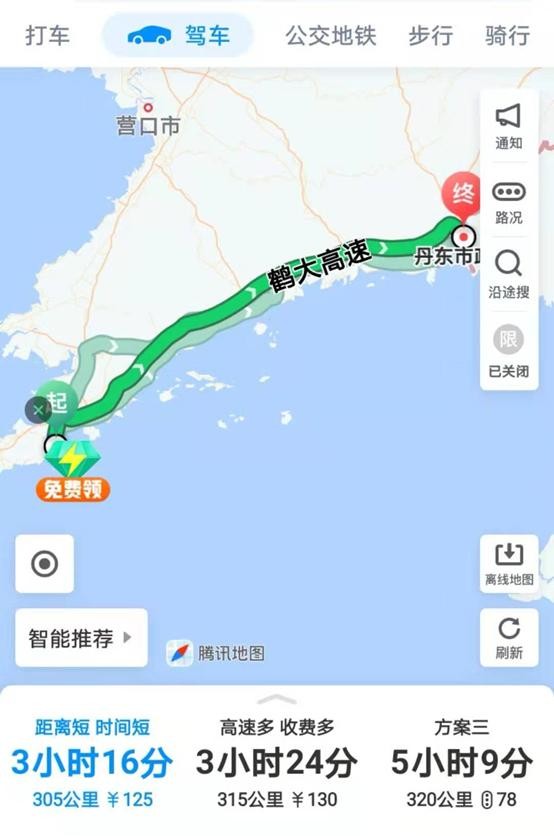今天的路线是从辽宁大连到辽宁丹东,按照导航指示主要是鹤大高速,全程约305公里,耗时3小时30分钟,高速费128元。午餐在丹东就餐。