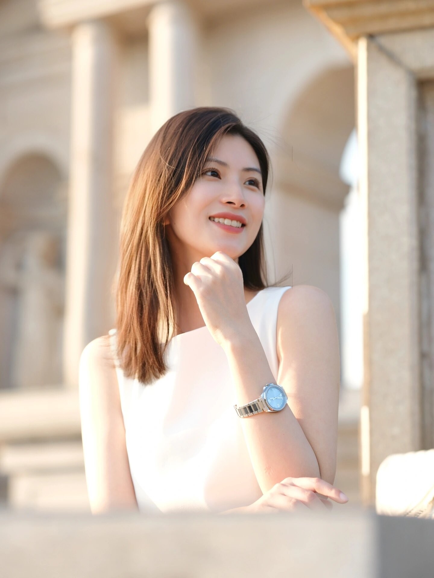 侧身站立,回头望向一旁而非镜头,这样的微笑会显得既轻松又美丽。