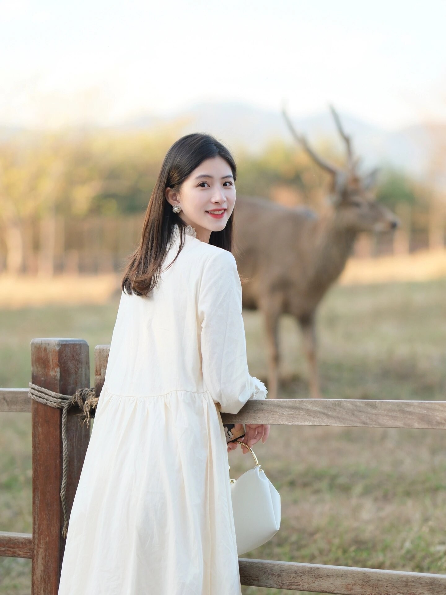 找到可爱的动物作伴,背对镜头回头微笑,和动物一起合影,显得自然又有趣。