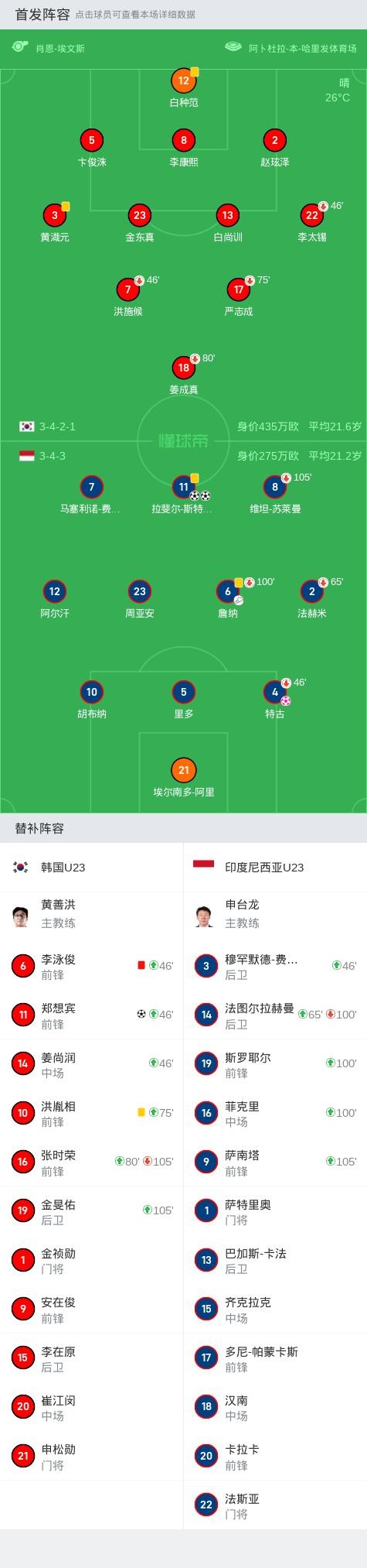 替换下场:46分钟22-李太锡, 75分钟17-严志成, 46分钟7-洪施候, 80分钟18-姜成真