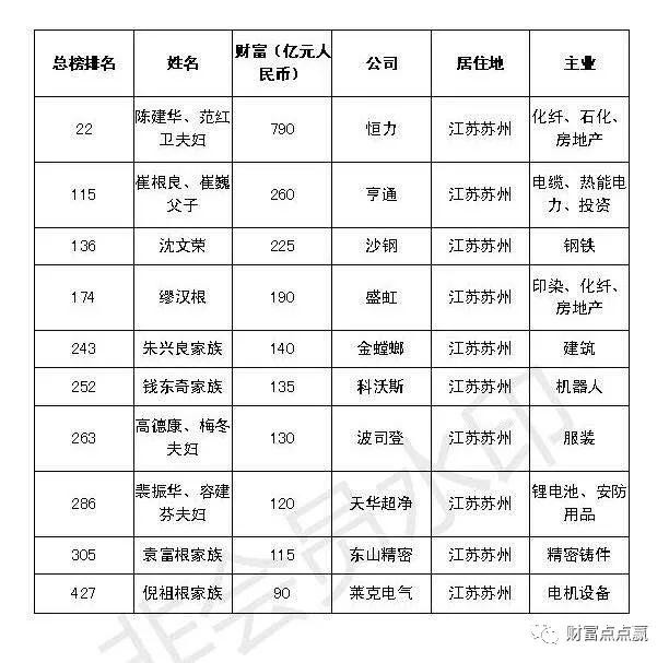恒力股份的陈建华、范红卫夫妇以790亿元人民币财富总量成为苏州首富,比去年增长了18位。另外,沙钢集团为榜单贡献了7位富豪,造富能力不容小觑。