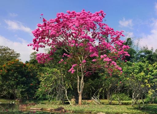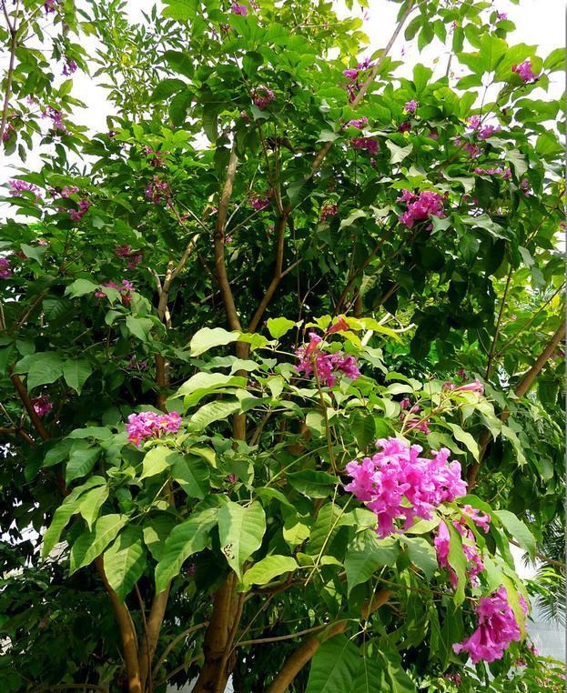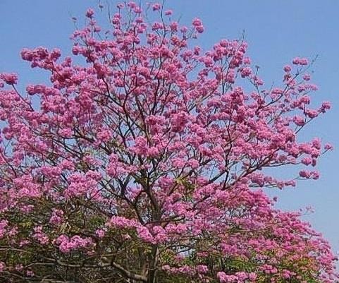 红花风铃木,紫葳科红花风铃木属落叶乔木,株高可达10多米,掌状复叶对生,小叶五片。又称紫花风铃木,粉花风铃木。