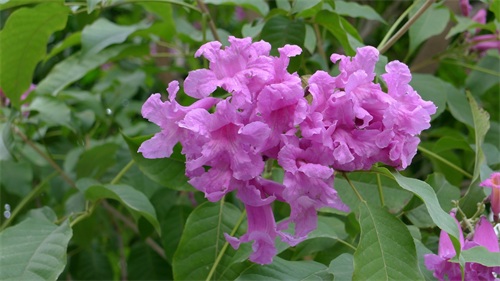 红花风铃木花冠铃形,粉红或紫红,小花多数聚生成团
