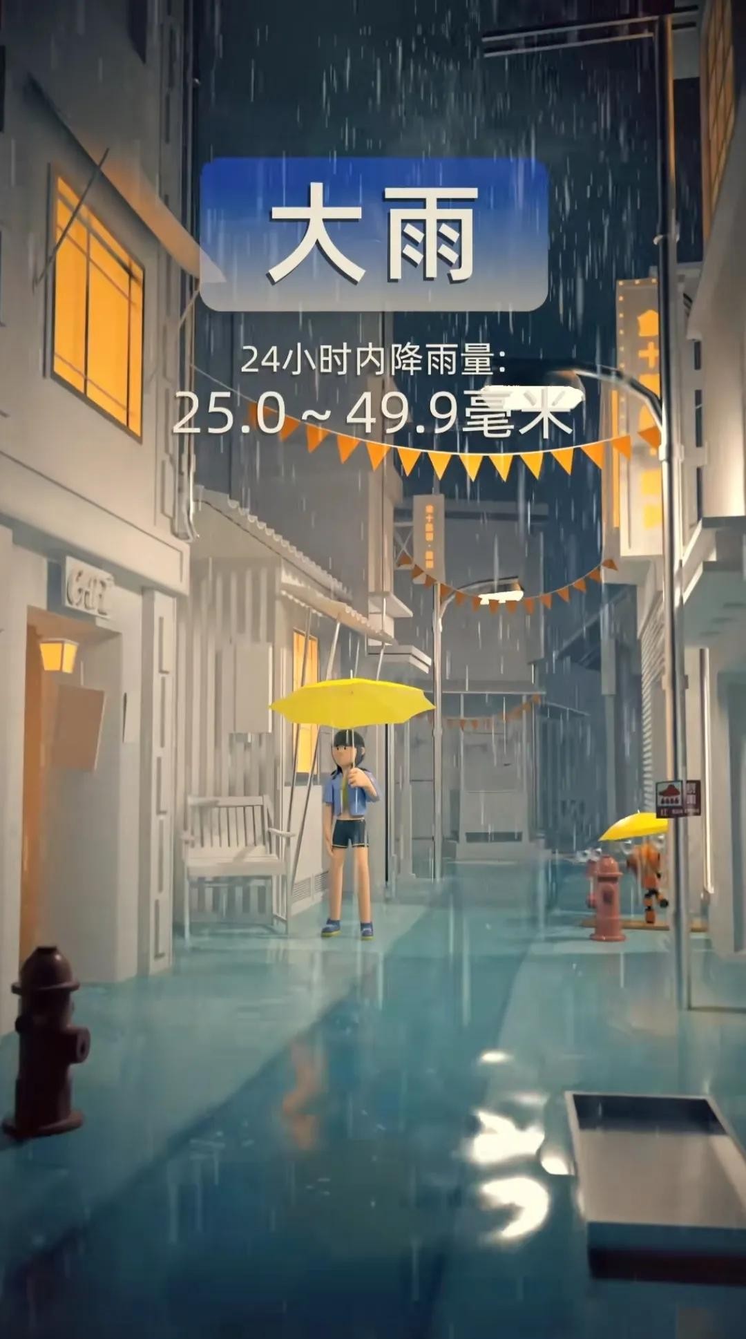 大雨:24小时降雨量在25~49.9毫米之间的降雨被称为大雨,这种降雨较为短时而强烈,可能导致地面积水和局部洪涝。