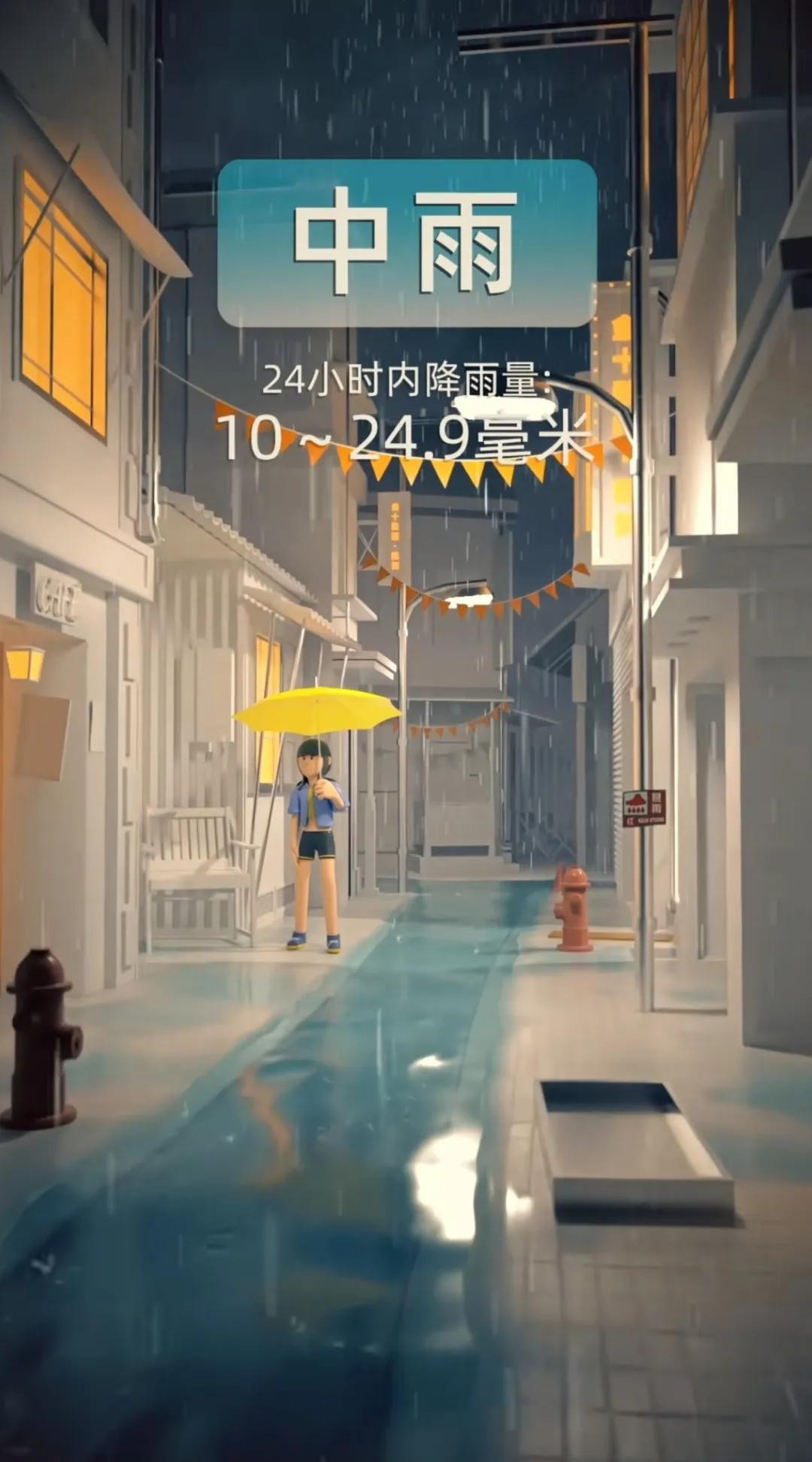 中雨:24小时降雨量在之间10~24.9毫米的降雨被称为中雨,这种降雨强度适中,对于农作物和自然环境有一定的滋润作用。
