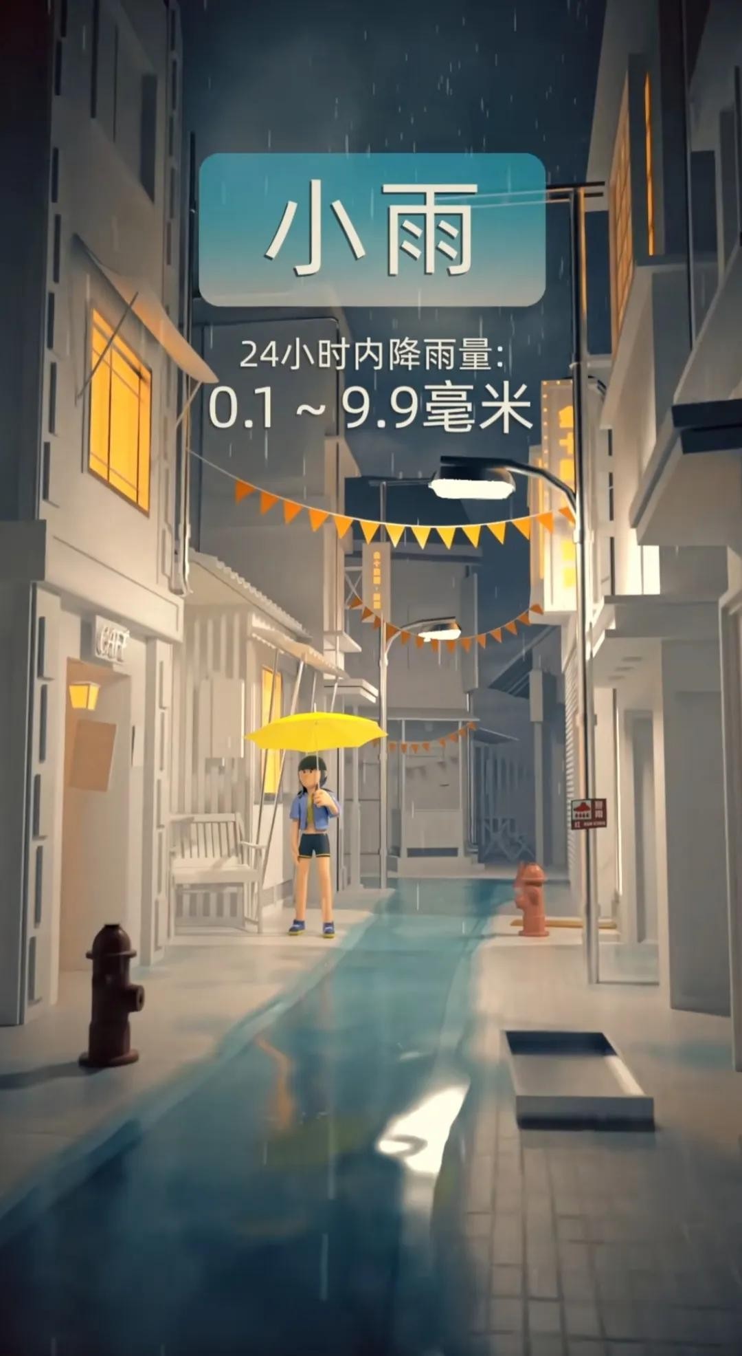 小雨:24小时降雨量0.1~0.99毫米的降雨被认为是小雨,通常是细细密密的雨滴,对于植物生长和土壤湿润有一定帮助。