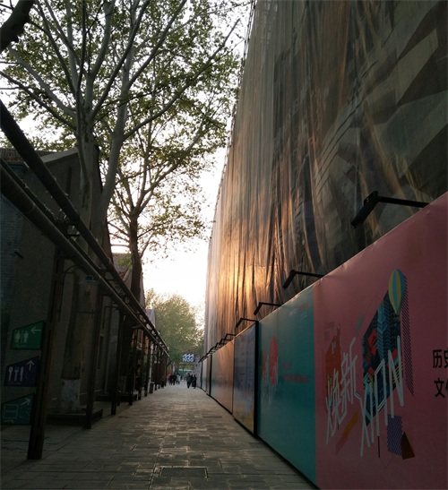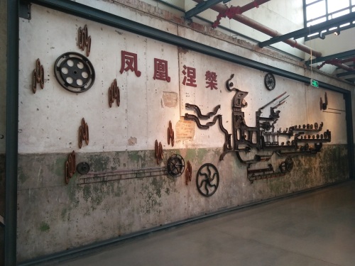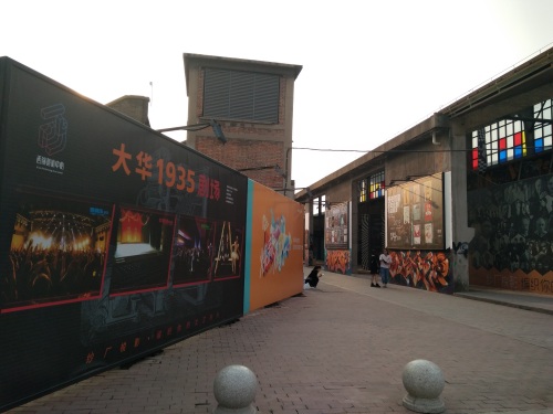 出了院子,映入眼帘的是原来纱厂的生产车间大门,历史的厚重和广告牌的现代感,形成了强烈的反差。