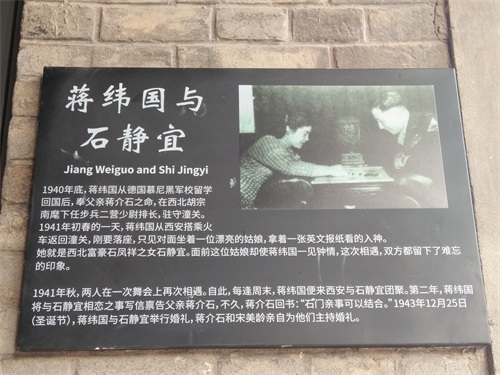 进门不远处,南边的门洞墙上,记录了蒋纬国(蒋介石次子)与石静宜(大华纱厂创始人石凤祥之女),从火车上邂逅的一见钟情,到最后终成眷属的浪漫爱情故事。