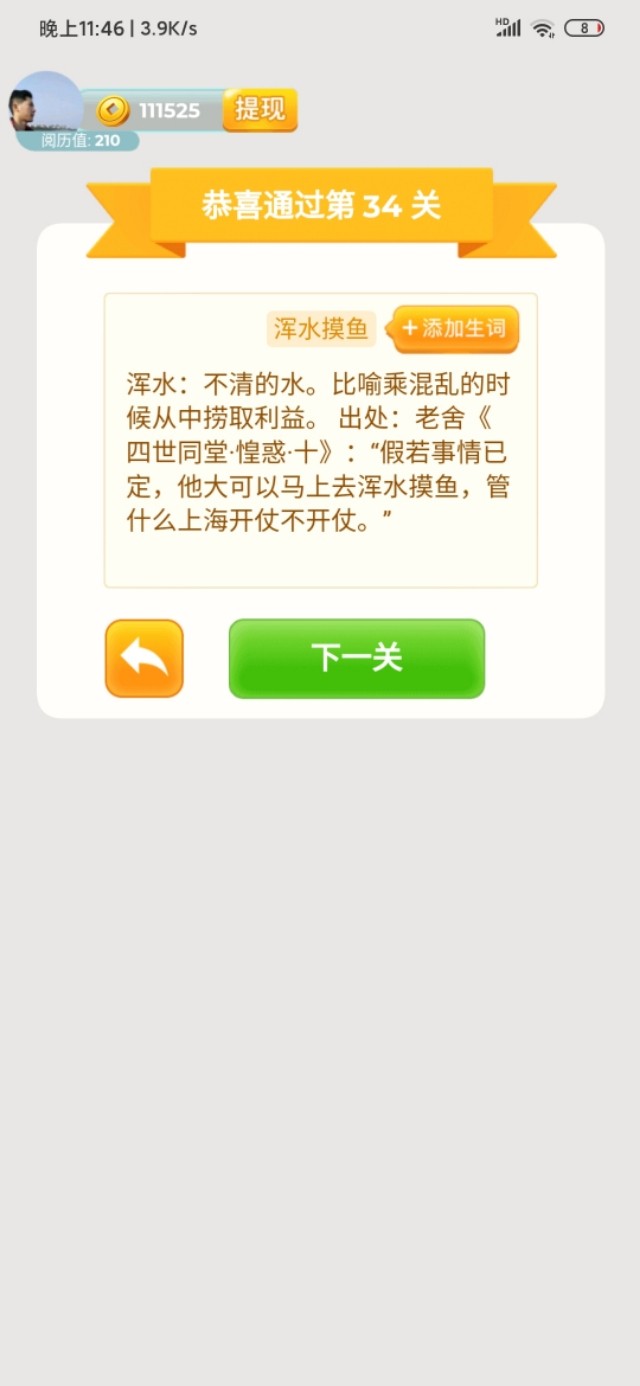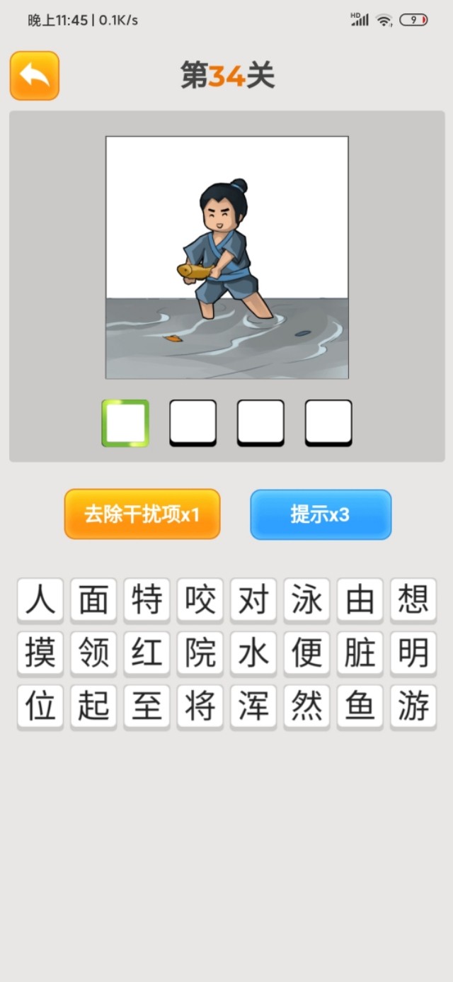 疯狂猜成语。一个人,一滩污水,抓了一条鱼。答案,浑水摸鱼。