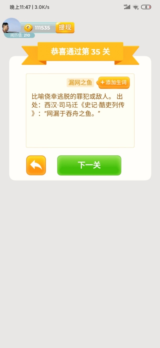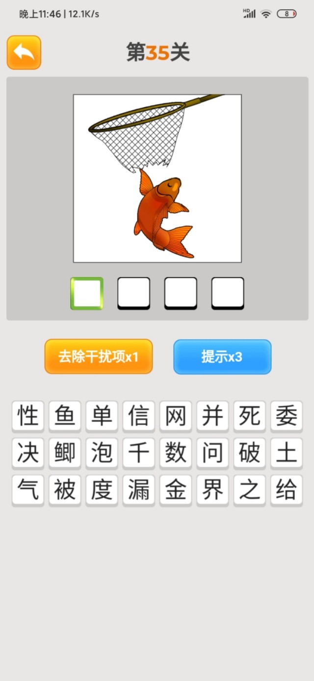 2020, 疯狂猜成语,第35关,一个网破了一条鱼在下面。