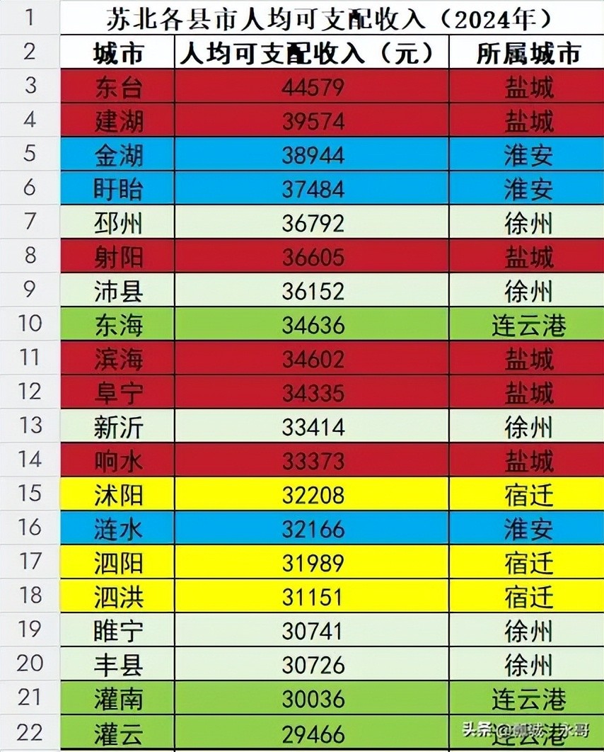 从GDP、财政收入上来看,苏北五市最低的县,丰县为最高,灌云县为最少,从人均可支配收入上看,盱眙县最高,响水县次之,泗洪县第三,丰县第四,灌云县垫底了。