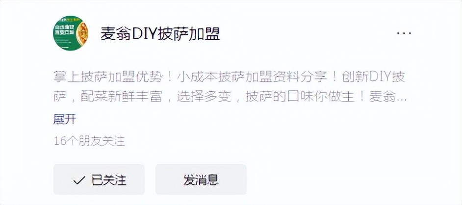 除了可以使用企业标志做头像之外,还可以用企业经营的产品做头像,使粉丝对企业的形象更具象化,还可以使公司的产品频繁出现在微信用户的视线中,增加点击量和产品曝光量,从而达到宣传推广的效果,例如我们的“麦翁掌上披萨”,就是自己本品牌披萨做的头像。