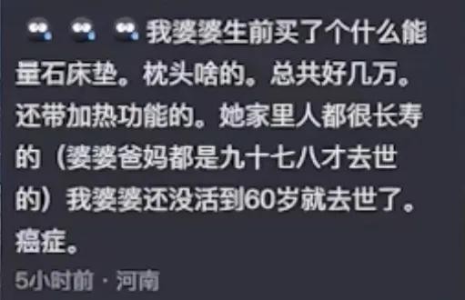 我婆婆生前买了个什么能量石床垫、枕头啥的,总共好几万,还带加热功能的。