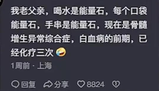 我老父亲喝水是能量石,每个口袋都放着能量石,手串也是能量石,现在是骨髓增生异常综合症,白血病的前期,已经化疗三次了,这哪里是什么能量石,分明就是夺命石。