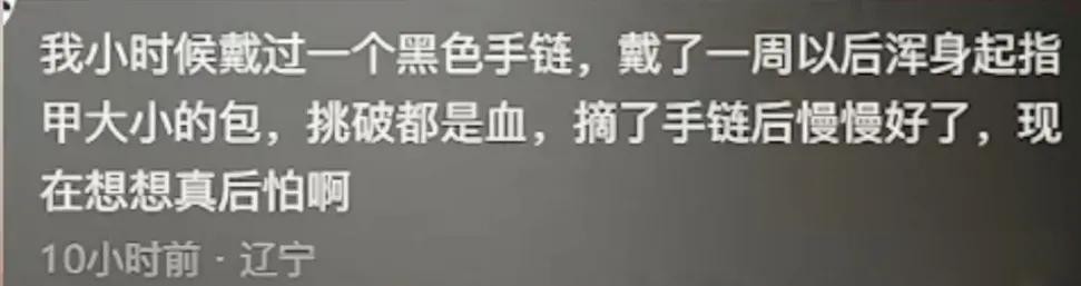 他家里人都很长寿的,婆婆爸妈都是九十七八才去世的,我婆婆还没活到60岁就去世了,癌症。我小时候戴过一个黑色手链,戴了一周以后浑身起指甲大小的包漂破都是血,搞了手链后慢慢好了,现在想想真是后怕。