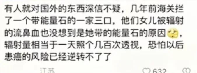 小时候我在路边买了个黑色磁珠手串,带上去之后一直觉得头晕,很奇怪,过两天忍不住了就丢了,结果头就不疼了,有些人就是觉得国外的空气都是香的,几年前海关拦了一个带能量石的一家三口,他们女儿被辐射的流鼻血,而原因就是身上佩戴的能量石,那块石头的辐射量相当于一天照几百次透视。就算当时治。他们的身体也已经不可能再复原到健康的状态了。