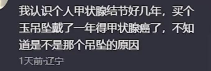 我认识个人,甲状腺结节好几年,买个玉吊坠戴了一年,得甲状腺癌了,不知道是不是那个吊坠的原因。