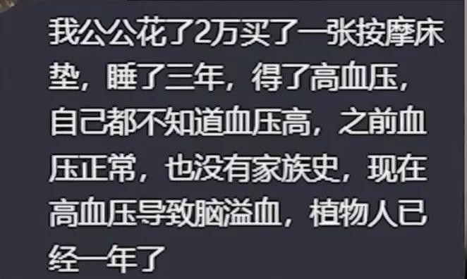 我公公花了2万买了一张按摩床垫,睡了三年,得了高血压,自己都不知道血压高,之前血压正常,也没有家族史,现在高血压导致脑溢血,植物人已经一年了。