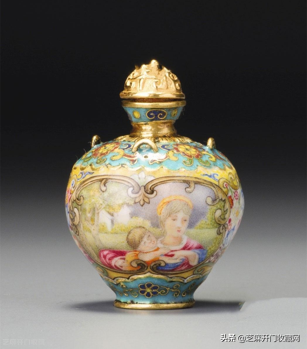 5:清乾隆金胎北京画珐琅西洋母子图四系鼻烟壶,尺寸:3.8厘米,估价:HKD 280,000,成交价: HKD 2,360,000