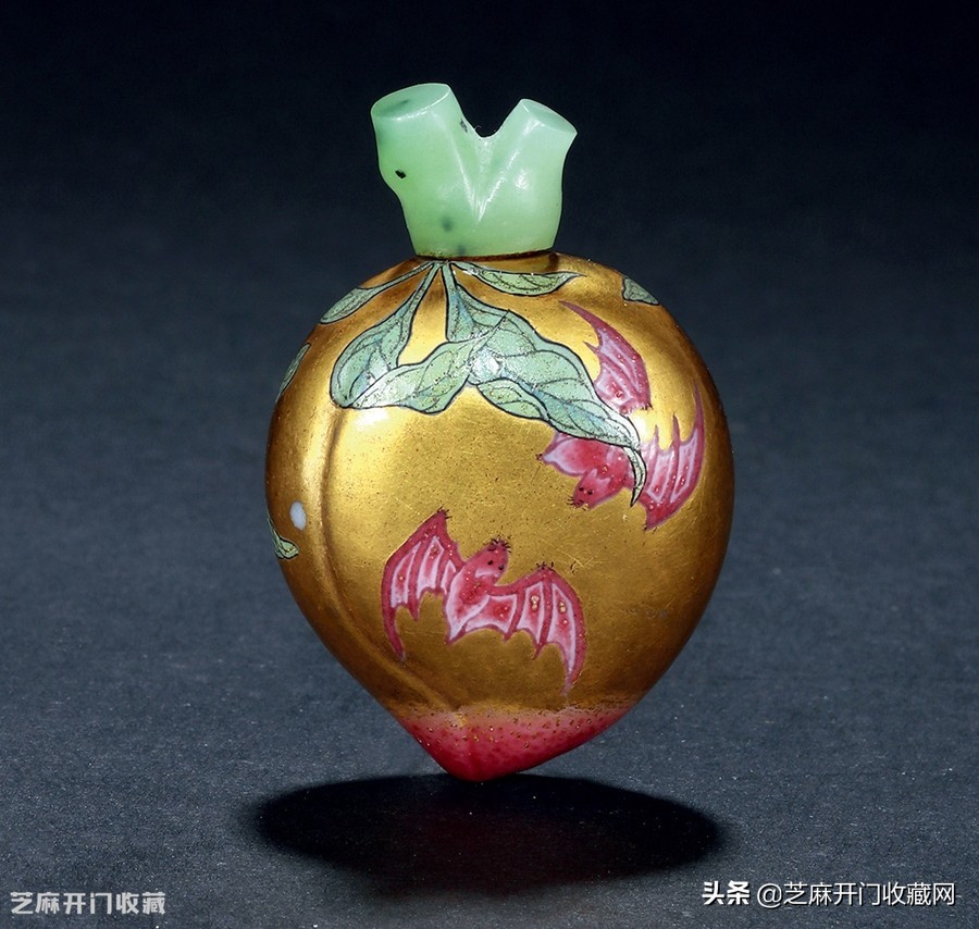 4:清雍正仿翠钮涅白料金地珐琅彩福寿纹桃形鼻烟壶,尺寸:高5.2厘米,成交价: HKD 2,400,000