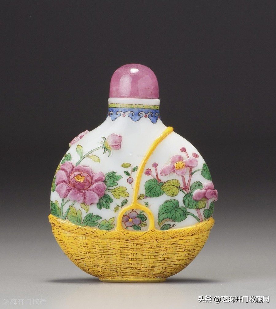 3:清乾隆御制料胎画珐琅「花篮式」鼻烟壶,尺寸:5.9厘米,估价:HKD 2,800,000,成交价: HKD 2,680,000