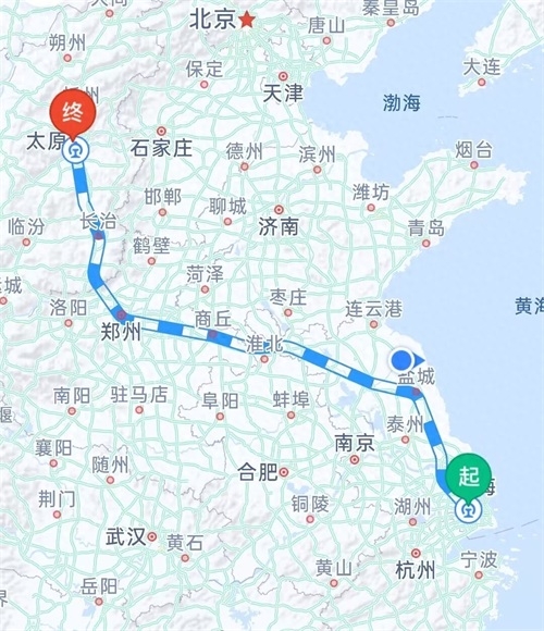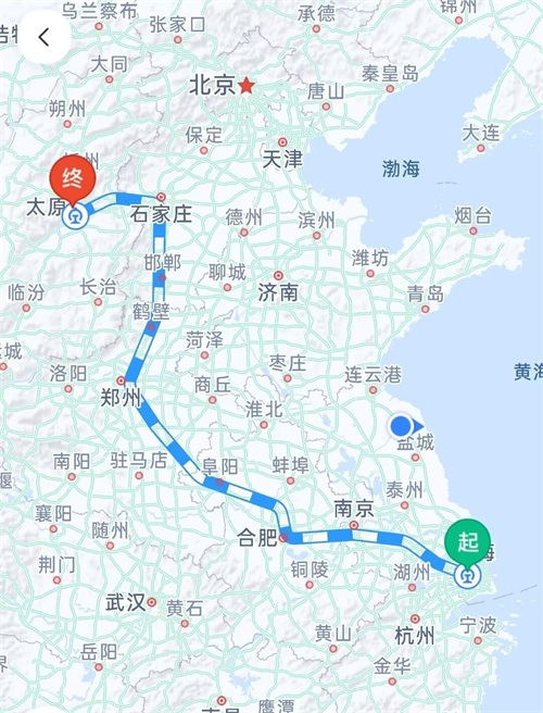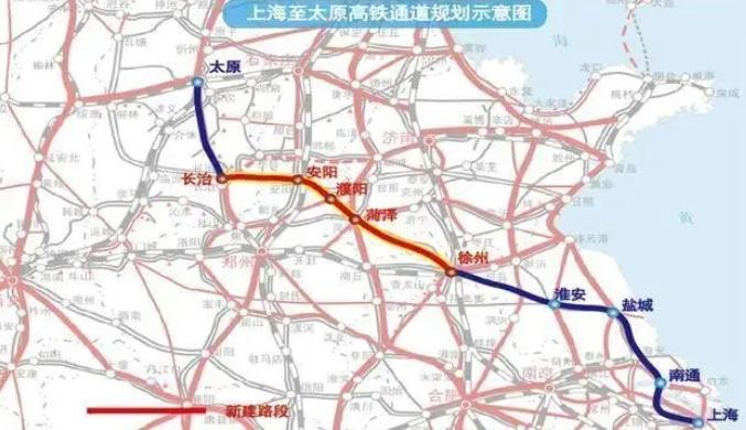 先来看一下线路,起于太原,利用郑太高铁太原至长治段,然后再规划建设长治经安阳、濮阳、菏泽至徐州的高铁线路,这样就进入江苏了,而江苏即便是苏北,高铁网也是不错的,利用徐盐高铁、盐通高铁、沪通高铁,就可到达上海了。