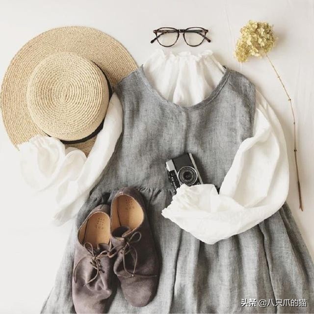 1.森女系穿搭=(棉质衬衣、亚麻裙、小皮鞋)+(白色、灰色、米色、深棕色)+(草帽、眼镜)