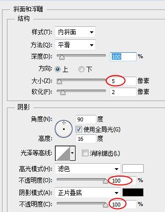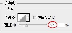 (14)使用“横排文字工具”在绘图区域中输入文字信息,然后执行“图层>图层样式>斜面和浮雕”菜单命令,打开“图层样式”对话框,接着设置“大小”为5像素、高光不透明度为100%、阴影不透明度为100%,最后单击“斜面与浮雕”样式下面的“等高线”选项,打开“等高线”对话框,设置“范围”为27%,如下图所示。