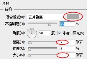 (15)在“图层样式”对话框中单击“投影”样式,然后设置阴影颜色为(R:168,G:168,B:168)、“距离”为7像素、“大小”为5像素,如下图所示。
