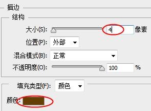 (11)继续使用“横排文字工具”在绘图区域中输入文字信息,然后执行“图层>图层样式>描边”菜单命令,打开“图层样式”对话框,接着设置“大小”为4像素、“颜色”为(R:101,G:62,B:2),效果如下图所示。