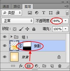 (17)为“倒影”图层添加一个图层蒙版,接着使用“渐变工具”在蒙版中从下往上填充黑色到透明的线性渐变,最后设置该图层的“不透明度”为44%,最终效果如下图所示。